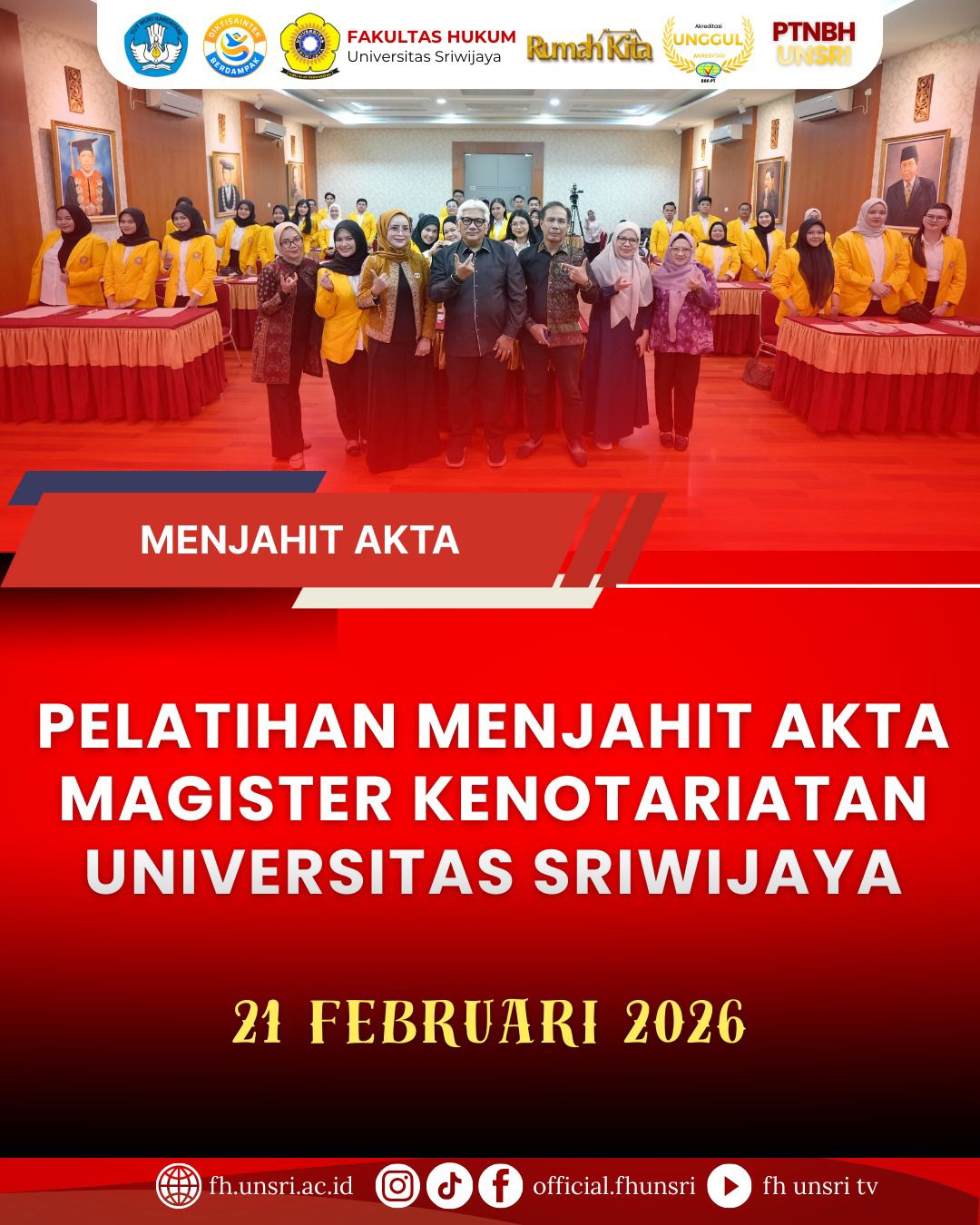 Palembang – Program Studi Magister Kenotariatan Fakultas Hukum Universitas Sriwijaya menyelenggarakan kegiatan Pelatihan Menjahit Akta bagi Mahasiswa Program Studi Magister Kenotariatan dalam rangka Meningkatkan Kompetensi Praktis Mahasiswa Magister Kenotariatan dalam Penyusunan Akta Notaris pada Sabtu, 21 Februari 2026. Kegiatan ini berlangsung pukul 08.00 s.d. 12.00 WIB di Ruang Prof. Zainal Abidin, S.H., Fakultas Hukum Universitas Sriwijaya Kampus Palembang.